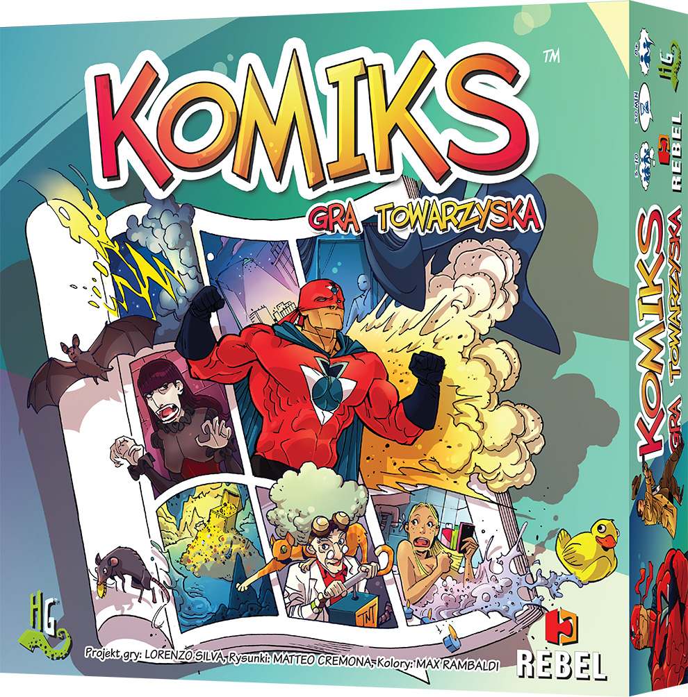 Komiks [Gra planszowa] : gra towarzyska / projekt gry Lorenzo Silva ; rys. Matteo Cremona ; kolory Max Rambaldi. - Gdańsk: Rebel 2014. - plansze, karty, żetony, klepsydra ; wym. pudełka 25,5x25,5x6 cm + instrukcja.